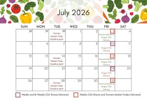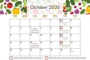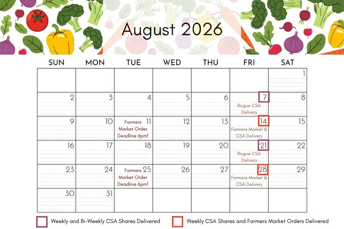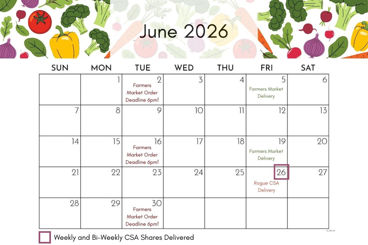 Visit our Rogue CSA Calendar to view the delivery schedule! The calendar shows the exact dates CSA Shares are delivered for both weekly and bi-weekly CSA Share recipients. The calendar also highlights the order deadlines for our Online Farmers Market, so you’ll know when to place a customized order if you wish to supplement the contents of your CSA Share.